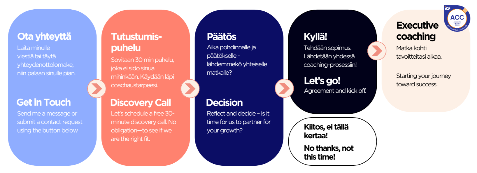 Coachingin onnistumisen kannalta on tärkeää, että coachattavan (sinun) ja coachin (minun) kemiat kohtaavat. Tutustumispuhelun jälkeen on täysin ok, jos et halua jatkaa prosessia pidemmälle. Päätös on sinun!